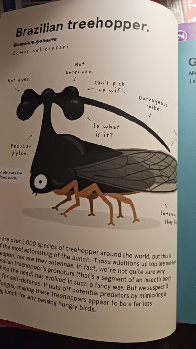 As I mentioned, the art was not completely 100% to my liking, but I did like it (probably a 90-95% like). They are colorful, but not overpowering. There is not a lot of details, but you get the point. I think that having the cartoon-like drawings cuts down on some “eeww factors” (I’m sorry that Mexican mole lizard is just (shivers!!!!!!) oogy! Though the Brazilian treehopper has its moments, too, but I did find that helicopter club on the head somewhat endearing) and allows you to see the animal whereas photographs would not. And the not “realistic” imagery allows for the tone to be amusing and not “just the facts.”