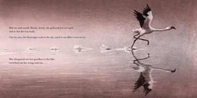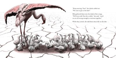 And while I said the same thing, they said it better. But I will add my two cents for the illustrations. You can get fancy and say “monochromatic”, but I say it a bit longer, the use of color is important to setting the tone of the work. The use of shade, shadows and lack of color is important. You are focused on parts because of what detail (or lack of) is presented. They are both comforting and a bit sad. You, the adult reader, know where Bibi’s (the older flamingo of the story who takes on many roles to help her family) is heading, but still, it is a beautiful way of doing it. The ending is not exactly what I expected, but it was a special way of doing it.