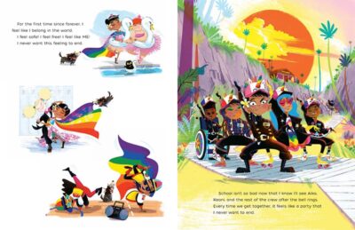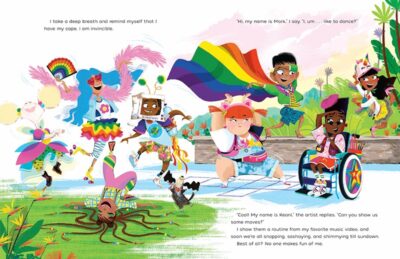 It is the art of Richard Merritt is really the freshness you might be looking for. With nods to things like his involvement with Janet Jackson (there is a fun scene when Mark is dancing that is a wonderful and terribly unsubtle acknowledgement of Ms. Jackson), we learn how wonderful Mark’s world is with all the rainbow colors, with all the different details and people that are in that world. The details and colors are bold, could be considered a bit too polished, but it is a “today’s youth” aimed book.