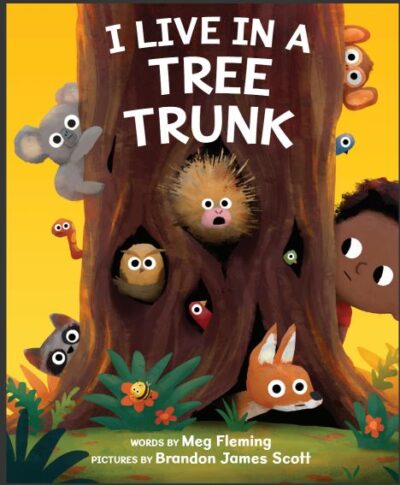 So say the animals (and much more) of I Live in a Tree Trunk. Each animal, in simple text by Meg Fleming and simple art by Brandon James Scott, tell us where they live. Things are aimed at the aged three and up, with a few rhymes to help pass the time.