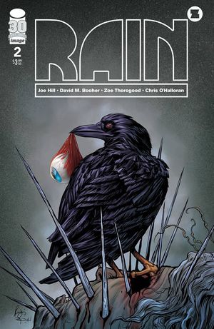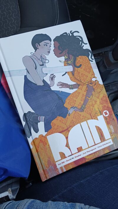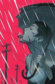 And now for the feelings of this graphic novel adaptation of Joe Hill’s novella. David M. Booher takes on a story that in the end is part love story and part environmental story, with a dash of family tossed in. The plot starts on a beautiful day in August in the state of Colorado. That clear day, the rain falls. Only it is knife-like blades coming down. The numbers are staggering for the death toll. But because Honeysuckle was inside the garage of a neighbor’s house, and the owner’s son, too sick to be outside, stops her, Honeysuckle survives. But cue the first tearjerker. Her girlfriend, Yolanda, and “bonus mom” (Yolanda’s mother), do not. The next tearjerker will come soon enough. Trying to make sense of things Honeysuckle starts off on a journey that will be part inspirational and mostly heartache. We learn