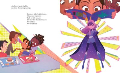Everything is brightly colored, and boldly done. It is not overwhelming but does encompass the story. It is supportive to the text. And the images themselves are round, smooth, “safe” which allows for a comfortable atmosphere for reader and characters. I had not realized Noor was also the illustrator of Brown Is Beautiful: A Poem of Self-Love, though they are similar. But the nice thing is they are also different enough to not feel like you are seeing the same illustrations.
