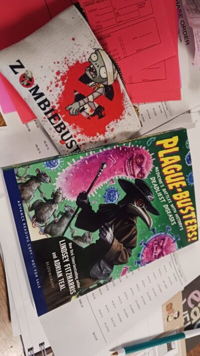 Plague-Busters!: Medicine’s Battles with History’s Deadliest Diseases by Lindsey Fitzharris and Adrian Teal is probably my new favorite nonfiction read of 2023 (I know it is still only late April, but something tells me I won’t be reading too many more nonfictions and if I do, nothing will match up to this). Due in October 2023, I give this book a 4.5 as I need to see the final artwork. What I had in my reader copy, was mostly black and white, but there were a few pages that had some that had one color (red) to them.