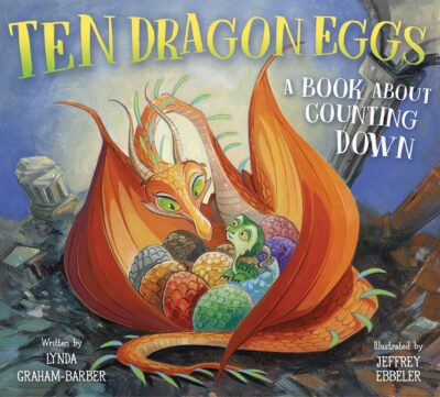 How can you not like the rich, jewel colors of Jeffrey Ebbeler’s illustrations in Ten Dragon Eggs: A Book about Counting Down? Okay, sure, they might be too cute. Or maybe they have too big eyes, but they do fit the story that Lynda Graham-Barber made for us. They are sweet, silly and have a cleverness to them.
