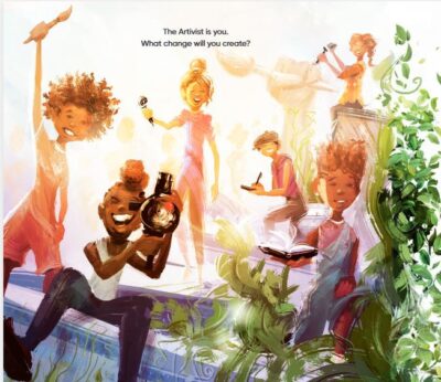 Some books are subtle, and some are not. The Artivist is not subtle. This is actually one of the pluses of the book, but also a minus. If you like picture books that are “Hey, you! Wake up and pay attention! Stuff is happening! And you can help make it better!” then this is the book you want. If you do not like that, or are not in the mood for that, then Nikkolas Smith is not the author you want.