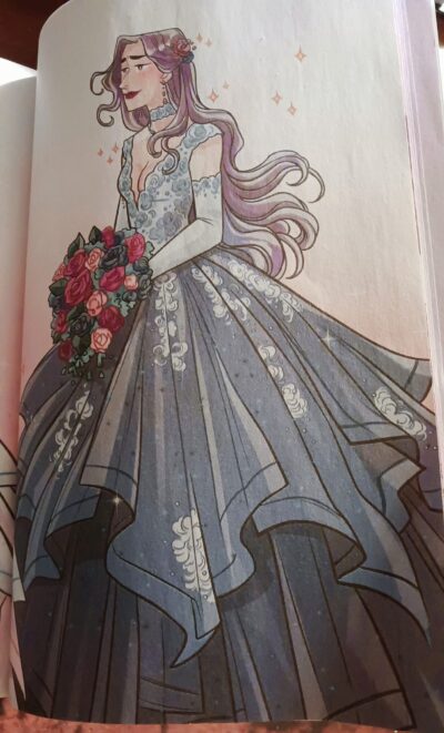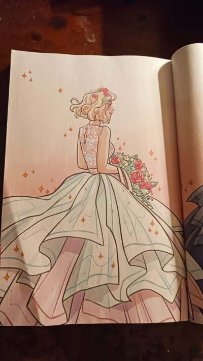 Delightfully clever and colorful images grace the pages (after all, there is FASHION!) and the last images are my absolute favorites (spoiler: wedding gowns). Funny, amazing grilled cheese sandwiches, and modern themes (no fur balls, same sex relationships, forced marriages, a women trying to make it in a “man’s world”, etc.) fill the pages. This is if Heartstopper and The Prince and the Dressmaker made a book-baby.