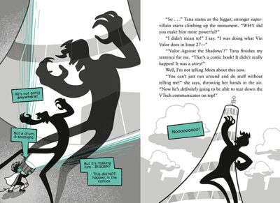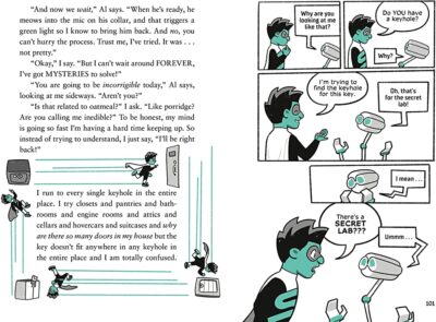 This is a fun book for reluctant and readers alike. Both illustrations (by Chad Sell who seems to be known for cartoon like imagery (or at least by me, but his is the author/illustrator to the Cardboard Kingdom graphic novel series) that are colorful, round, and bubbly, silly and familiar all at once. They are kid friendly and allow the tone of the story to come through) and text, make this a novel and graphics novel combo. Everything allows the funny but gives you the adventure (we have a missing mom, some bad guys/villains who might not be so villainous, their super-villain (or not) kids, and the maybe/maybe not hero) but gives you time to make your own conclusions from what is presented. You see what is happening, and as we follow the Stupendous Switcheroo himself, we must ask, “Who is good? Who is bad? And who wants to use the teleporter?”