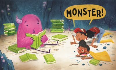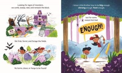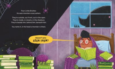 Brave Enough is a picture book that came out last year. It is a book about two siblings (Younger Brother and Older Sister) who are off monster hunting. Or more accurately the older sibling is showing the younger sibling that t here are no monsters. In fact, her brother does not see them every place, as they do not exist, they are fake, not real, fantasy and certainly do not read books about vampires, zombies, and humans. But of course, they do, and of course the older sibling needs to pay attention to her brother who knows a thing or two about a thing or two about monsters.