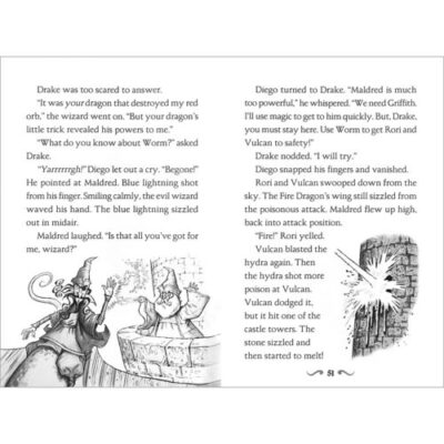 The story is simple, four children (two boys, two girls) are Dragon Masters. Each person has their own story, and we focus on the Rori and her fire dragon, Vulcan in this one. But Drake (human) and Worm (the dragon) are not only back (their book was the first one), but also featured as Drake and Rori and their dragons, fight the dark wizard (obviously introduced earlier. But if you know villain cliches, then there is no question he is not just a “bad guy” but the bad guy). The other two people, Bo and Ana are off at an event to show off the dragon “army” of the King (and the adult can see to impress that kingdoms Queen). Bo and Ana are an attempt at diverseness (Bo is