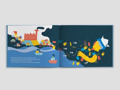 Cecile Elma Roger and Eve Gentilhomme put together a book that is both modern and classical feeling. Before I knew the author and illustrator due were from France, I felt a non-Western/non-American feeling to the atmosphere. The art is colorful and lacking in serious detail, but what you need is there. The illustrators are almost surreal and yet you can tell what a fish is, or land, a house, etc.