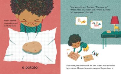 It might sound depressing, but it is not. And while Lacey’s story is not really my cup of tea, it does work for some people. And the message is nice, as we realize our hero is learning responsibility (after all any pet needs the things that potato is given). And with Abe’s simple (not simplistic) illustrations, we get a lively background for the story.