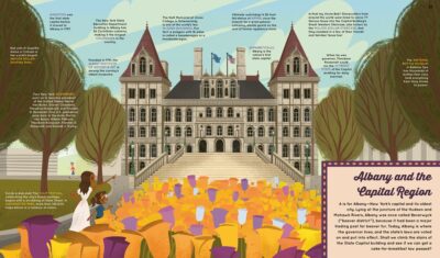 Heather Alexander shows us that we can craft our own kazoo in the Kazoo Museum in Eden, New York. We find out the state fossil, the state abbreviation, the capital cith, and so much more. Each page is stuffed with facts and fun. Did you know that four New York governors have become president; and five presidents were born in New York? Or that the Albany area was once called Beverwyck (beaver district)? Well, you do now, and you can learn this and more (such as the state snack, about sponge candy, Cooney Island history and the hot dog, what a slice is, bagels and lox, and nonfood facts too like the state bird can sing with its beak closed) in this fun book due early September 2023.