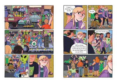 The artwork is fun, bubbly, and clever. There is a not a lot of details, but there are the ones that are important. Things like the alien parade, the town itself, and such things are busy, but when you are out in the desert, things represent that aspect of the trip as well. The author/illustrator is the same as Hilda books, but while they are similar, they are unique as well. I think they are my favorite part of