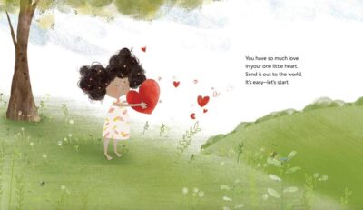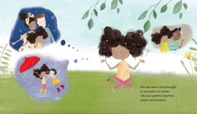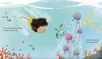 This is a “kindness meditation” (as the publisher description says) but since I am not a fan of the word mediation (has too many connotations of being “lofty” and “better than you” for me), I want to call it a Kindness Poem That is not a Poem but is a Poem to. It is a nice message. It is a sweet message. It is a modern way of telling children how they can act to make a not so pleasant moment or time, or even person, a little better. It is how we can send a hug or send love to people who are not with us or are far away. It is also a safe way to give care to the natural world around us.