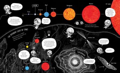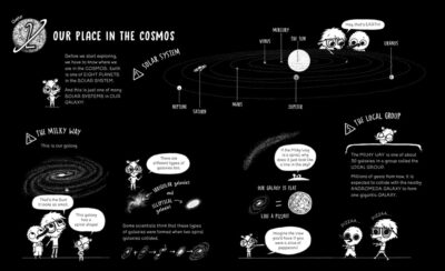 Despite this “in the middle” feeling, I was getting a good feeling about Gaelle Almeras’ graphic novel. I was excited to learn about astronomy, to explore space. And the fact we were going to do it in a fictionalize nonfiction manner made it feel like it was a good way to start. Therefore, we can relate to the facts, by seeing them in “practical” use, not just strung out on the page. However, that missing feeling stayed. Such as, there is a comment around chapter three that talks about Pluto, but it is abstract, and not feeling connected to the rest of the information.