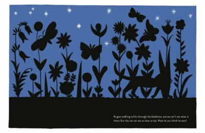 How it is presented: the illustrations are first (after the initial of seeing the farmer and cat getting ready for the night in a more “full color” manner), the cat is covered in silhouette. Black and blue pop off the page. Then the question of what the cat is seeing when it is dark is given, the next page is what the cat sees, as the cat can see in the night as well as we can in the daylight. The contrast of the dark and light is, well night and day! We see a family of skunks out for a stroll, the chickens and dog asleep, the cat sneaking about looking for a rat to catch. You guess, but then you are given the answer.
