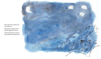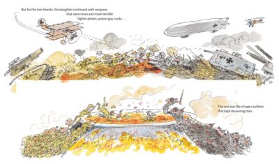 One of the most powerful parts of the story is that Jacques Goldstyn does not sugar coat things but is not gratuitous either. They come out and say that war sucks, but still appropriate for older listeners/readers. The art is where things are 50/50 for me. I liked them, but not all the time. Or I liked a piece of one. They are as the cover shows, a cartoon-like image but one that is hiding something underneath. However, I cannot say much else about the book, it is a “you must read to take away what you need to” book. I would say this book, while dedicated to the official last man to die at 10:58 AM, is not totally prowar, but also not completely antiwar either.