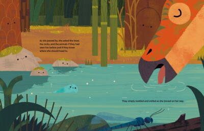 This is mostly set in the time of dinosaurs and such creatures, while also having an odd, out of nowhere, spiritual element. This comes into play in this due in September 2023 picture book by Gregoire Laforce intruding a question from Drop that gets an answer from a disembodied voice. You, see the answers the drop of water have been given are vague, and not really answers (she asks animals “have you seen me before” or “where am I going?” but only gets nods and ignored). When the drop hears the voice that tells her the “you’re okay” message, she “knows” the voice and is satisfied. So, insert your interpretation here.