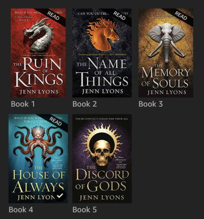 Jenn Lyons has managed to create a complex, compelling and creative universe populated by complex, compelling and creative characters. There are familiar fantasy tropes and subversions that made me gasp and grin. There is some truly excellent work on gender and sexuality and family and class and love and sacrifice. I was excited all the way through, I never reached a point of “get on with it” AND it all made sense! The character motivations worked, the plots tied together nicely, the conclusion was satisfying and left me wanting more at the same time.