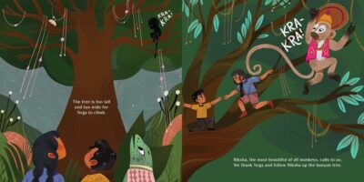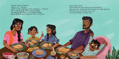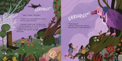 When a little girl is hungry, she and her family eat the dosa the mother makes. But the little girl accidently sets off a series of events when she reaches for the last one. It comes to life and sings a little ditty, then runs off. Then the girl and her brother run after the dosa and find themselves in a magical realm where the creatures of the Hindi mythology and legends are real. As these magical, mythical beings help the siblings, we see the lush fantasy realm with illustrations by Parvati Pillai.