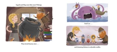 The artwork is contemporary, amusing and it a character by itself. You see lots of details, busy colors (I liked how they used purple), and a mixture of a classic story and modern as well. There is a nice message (do your best, try hard, and be yourself) but it is also just a funny story about the smallest contestant going up against some big, bad, Vikings, and kittens. Most ages can enjoy it, but it is best for ages five and up. And while it could be a good read aloud, I am leaning towards more of a one-on-one read.