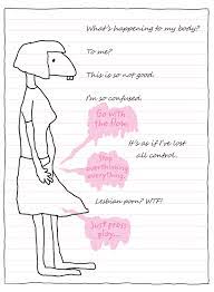 The graphic novel, When I Came Out has a European mentality to sexual imagery and drug/alcohol use. Therefore, this is an adult first (mature teens second) aimed, is not for all audiences. This is an agult graphic novel as the idea is based on how Anne Mette Kærulf Lorentzen came to terms with her sexuality later in life. This “late bloomer” (taken from her support group name later in the book) finally came out to herself as being a lesbian after 10 years of marriage and four children. She was bombarded with what a Girl should do/how she should behave. She should get married to a nice strong man who can take care of her. She should be a happy housewife, mother, and wear pretty dresses and be a “good girl.” Flash forward from 1988 to 2018 where she finally allows herself to say, “I am a lesbian.”