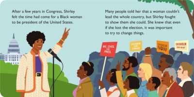 This is not to say the subject should not be given to this younger age (board books tend to be older baby to toddler), and Shirley Chisholm is a great person to highlight. Not only are you getting women’s history, but black history, and even political history. Everything is an introduction, and straight forward. Granted there is a bit of finger pointing (none of the white men wanted Chisholm to run/win/be there and/or wanted to change the old, unfair laws), but it is not wrong. Just, perhaps it could have been a bit more, shall we say, diplomatic in trying to get the point across? Know your listener and/or reader before giving it to someone
