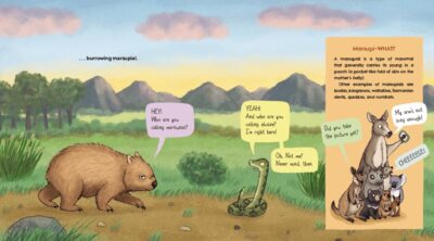 This book due in late May 2023 (yes online reader copy again), is also illustrated by Cushman. Their illustrations are colorful, cute, silly, goofy, and enjoyable. They allow the humor to come out, and the fact that we have a talking snake, several wombats and other animals talking, seems natural because of them. However, there are also scientific images, sections/boxes as well. For the first time I found out how the cube o’ poop is made as there is nothing square about wombats (weird, but not square). And since things are drawn it is perfectly tastefully done (of course, one image might have me swearing off brownie cubes for a bit).