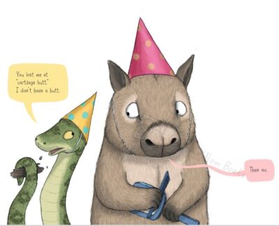 I am not sure why there is a snake in Wombats Are Pretty Weird: A (Not So) Serious Guide by Abi Cushman, other than comic relief. Regardless of the way, the snake and we the reader, learn all the poop on wombats (or what could be put in a picture book for ages at least five and up). Most people know wombats have square poop, but did you know they have strong cartilage butts? Or there are three types? Or that they have backward facing pouches (the only marsupial that does)? You will learn that and more in Cushman’s book.