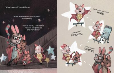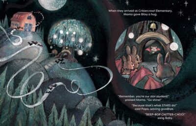 Afterall, Bitsy is a special star. Her special brain works differently because she is representing a neurodivergent person. She, like the author, Kaz Windness, is autistic. Of course, they do not come out and say that, but just use the natural senses of a bat to represent the situations an autistic person might encounter. Such as loud noises and light being too loud and bright. Or doing things the “right” way can make you dizzy, or not work out very well (finger painting for a bat has issues to say the least). And how all of that stimulation could lead to becoming upset, and make the child have a very big meltdown.