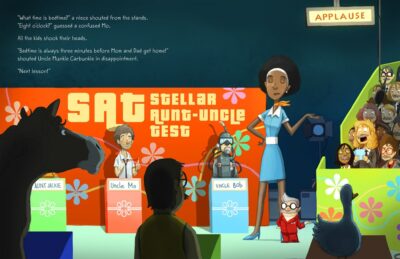 And that is what the book is about. I cannot tell you things like the proper bedtimes, or how much ice cream is allowed before broccoli, and such things as that is the secret of Auntieology and Uncleology. But Uncle Mo of the story, realizes that he has a few lessons to learn to pass the SAT (Stellar Aunt-Uncle Test), but so does his nephew, Leo, when it comes to the fact that Uncle Mo is not as dull as thought of at first.