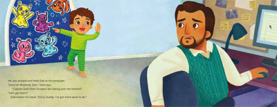 Zain is a young boy who is ready to go-go-go! on Friday morning. However, his father must work, and when he is done, it is time for prayers. We are exposed to the Muslim culture in a positive way. There is no racism, just a beautiful story about father and son and their faith. We see what they do at the mosque, the rituals, the prayers, the community that they have there. And this is also a book about patience, as Zain wants to play, (as my nephew once told me) “play play play now now now!” (that kid is now 23 and over six feet tall), but his father has things he must do, and they must wait to fight the aliens and be heroes!
