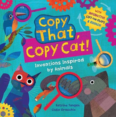 I am an adult. Okay, I am physically an adult. Mentally I am the perfect audience for Copy That, Copy Cat!: Inventions Inspired by Animals. Or at least the part about peeking into cutouts and opening the flaps. The idea of biomimicry might be a little over my head, yet, somehow a board book introduced the subject perfectly. Due to the board book format, this might turn off some of the older readers who would be able to “get deeper” into things, but if in a classroom setting or if your child grew up with it, it would be perfect.