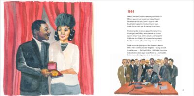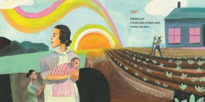 Alice Faye Duncan saw a woman who was more than the veiled lady at her husband’s funeral, and shows how she was a spitfire. With her music, and her determination shining through the poetic prose of Duncan, a woman who shapes history comes alive. And that is shown in creative images of the illustrator R. Gregory Christie. The images are interesting in the way they are presented. You can see how she related to the people and places around her. You see the history unfolding, and how the colors and details mix, support that.