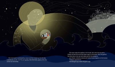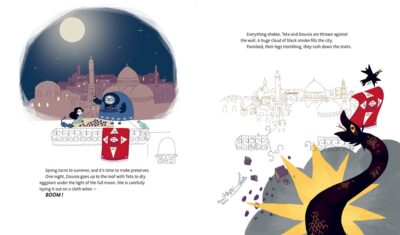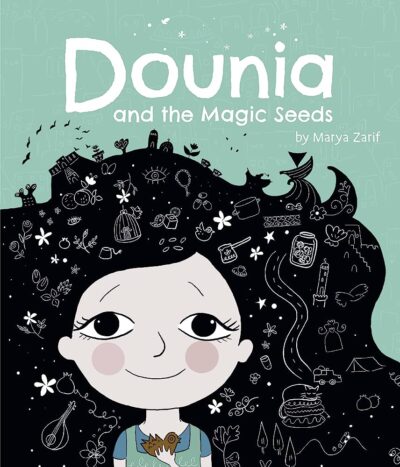 The illustrations show the story Marya Zarif made as both companion and supporter, but also giving them life of their own. We follow Dounia in the days before war hits her grandparents’ doorstep. We have seen the smells, sights, and traditions of her home in Aleppo, Syria. We are also given a foreshadowing of things to come when the grandmother gives Dounia four seeds to hold onto, but does not give a particular reason. When they must flee the country, Dounia only has a soap bird and the seeds, which will create magic to help the family get through difficult times.