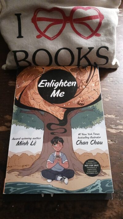 Enlighten Me is a mindfulness/meditation graphic novel for the 10 and up crowd. There is a little bit of a social theme added with the racism the school bully directs towards the narrator, but the idea is how to deal with the emotions and a situation that triggers and not necessarily this particular situation. The entire book is mostly in “thought bubbles” as the narrator and his family are at a silent retreat, and therefore, unable to talk once there. But to allow the teachings of Buddha to be introduced, there is a character that is allowed to speak. Minh Lê’s graphic novel is probably not for the active child who likes action stories or for the traditional graphic novel reader and therefore that makes this a hard book to recommend. I was not “loving it,” but I actually think I might read it again. There is a lot going on, but also it is fairly straightforward, yet I probably missed a few things.