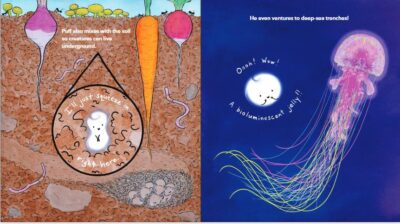 Puff: All About Air by Emily Kate Moon and also illustrated by Emily Kate Moon is due mid-March 2024. The two areas that had older information are added in a way that allows them to be skipped if the child is not ready for them, but are there to allow for growth. The story is straight forward, the facts are fun and not “dry” and even an adult can understand and learn! (Picture a smiley face here). The life cycle of a puff of air is followed around the world, into the sky, ocean and even underground. The simple text is detailed enough so you know what is happening, without being overwhelming or too technical. The art is adorably cute, funny, and supports the information without taking away from it. And it could be considered its own character, but a supporting one (remember it is supporting, not the lead). I felt it was clever and even though, yes, there is a smiling air puff called Puff (and all of Puffs friends) that is super-duper cute, it is not sappy. Best for a toddler on up.