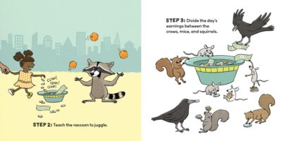 At first Bambi Edlund’s book started with a bit of a, “Oh no. This isn’t going to work.” But soon, something happened and I felt that unless something really horrible happened, I was in love. That little something was that the characters in the book paid for the things they took. I do not think I have seen a book where this was as obviously addressed. The narrator even says to make sure they “pay for the items.” And though they borrow (though looks like stealing) a hat and some food, they use it to make money to pay for the oranges they juggled (read to find out why a raccoon juggles oranges), and return the hat.
