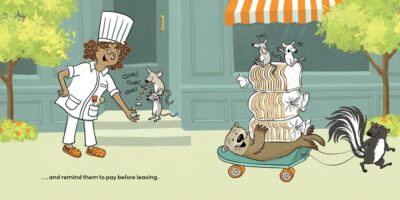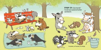 The story just goes from there. The start of the story is cute, it tells you all the things you’ll need to make a peanut butter sandwich. Things like three oranges, a skateboard, some squirrels, mice, raccoons and a moose. Some peanuts, a skunk, four red clogs and so forth. Then we learn how to make the sandwich. Everything is over the top, clever, silly and even this ol’ grump had the giggles. So trust me, your child (of most ages) will be rolling on the floor busting a gut.