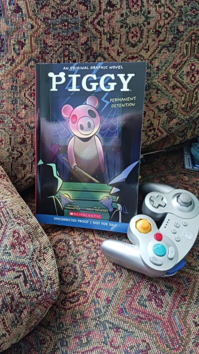 Permanent Detention (Piggy Original Graphic Novel) by Vannotes and illustrated by Malu Menezes was actually a little spooky at times, but good for the at least strong eight and up read. However, I would say more liking ages 10 to (young) 13. If you know the game it is based on (Roblox), that might help, but is not really necessary. The characters are a bit stereotypical, but still relatable and if there are further stories, things could be fleshed out more and could focus on other characters besides Willow and Cami. It is a thriller-horror story, so sensitive readers might be turned off, but overall things are well handled. As my copy was a reader copy, images were not complete, but they look like they will fit the story well and move things along.
