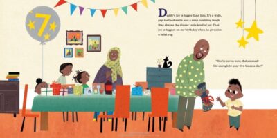 The illustrator Hatem Aly (of The Proudest Blue fame), created beautiful illustrations to accompany this story. The fun part about them is that they are lighter and breezy, though I would not say they are cartoony, but they are whimsical and have a cartoon element that makes them accessible and tones down the seriousness of things. Yet they do not take away from the importance of the act or the action of the story.