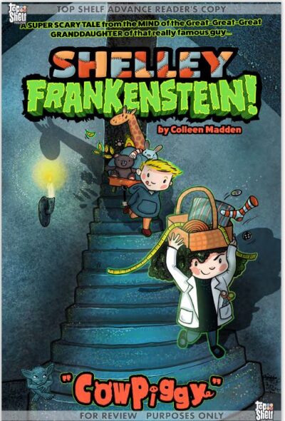 Do you want a book where your main character has a “loud personality” and is a big sister, and is a person who does not realize that people do not like to be scared (not even a little bit) most of the time (if not all the time)? Then you probably want to read the graphic novel, Shelley Frankenstein! V01 CowPiggy by Colleen Madden.