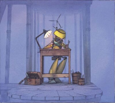 The theme is simple, environmentalism. However, it goes deeper. The emotional pull of what happens if we do not pay attention to our world and that environment is the focus. There is a large robot character that tries to help the animals of the world. A world that is now completely flooded with patches of land. The robot (I call Ernest, or Ernie for short) does everything it can from feeding the tigers to taking the pandas off the cliff. All the while Bob is doing things. Each person will take a basic idea and then interpret it their way. One day Roberta (another robot) comes along (Bert) and they have a hot air balloon. Things get real at this point.