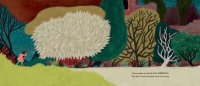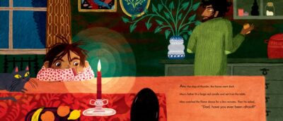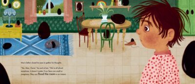 Overall, the theme of fear done in a poetic manner is unique. The developed nature of the theme is clever, but as I said, is not for everyone. And while I appreciate the work that goes into the illustrations, they were both lovely and odd. Ana Sender has an interpretation of things that is both realistic and abstract. The fathers long, triangular face, reminiscent of Rasputian. The boy’s bushy eyebrows and “just got out of bed or a wind tunnel” hair. Earthy, and darker tones for colors setting a deeper tone to things. All of this comes together for a modern story, about an old school concept, fear. There are also elements of classic, old world folklore, but is a story about the whys we have, or might have, fear.