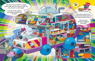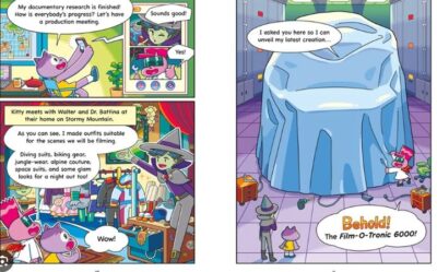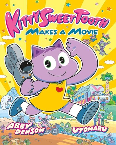 And this time author Abby Denson and illustrator Utomaru made a story that was maybe not as strong as book one, but equally fun in its own way. We have our friends from book one who are happy helping each other at the theater, but now Kitty wants to make movies, and not just show them and serve wonderful snacks. She decides to make a movie about her adventures finding some very special foods for new snacks. Things work quickly, we bounce from ocean to desert to jungle to the moon within seconds. Who knows how long things take in reality, but this is a book for kids ages six to ten. It is a fantasy! It is silly! It is a very pink and pastel and colorful graphic novel! Who needs reality?