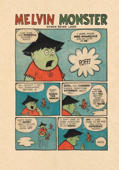 I am halfway through (there’s around 300 pages) John Stanley’s (Little Lulu comics ) graphic novel/comic Melvin Monster. My first thought was, “Those are some old fashioned illustrations! Like something you’d see in MAD Magazine or an “adult magazine” that I wasn’t allowed to look at as a kid, but found my uncle’s copies of anyway. You know, magazines like MAD, or adult comics, but not, “Adult” magazines. (The publisher description says: it draws its direct inspiration from the 1960s monster craze and the work of cartoonist Charles Addams and its television adaptation The Addams Family as well as The Munsters, however, Melvin Monster is all its own with Stanley’s superior cartooning skills, melding pop colors, expressive lines, and funny jokes on full display.)