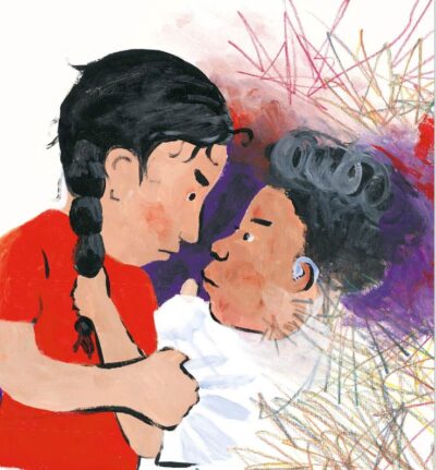 Told from the point of view of the younger brother (who we will learn is different), when he and his sister fight, they do not use words, but just push and pull. And they hurt each other. Then he goes off to his room to draw pictures of terrible horses who bully a little pony who is smaller, cannot hear, is quiet and slower. He is the little pony of the stories. And after time, he puts the pictures/the stories into a book, which one day goes missing. In short text and simple illustrations by Ken Wilson-Max, we see and learn how just maybe our narrator’s sister is a pony, too, and how they can work together. The soft illustrations and the minimalist arrangement gives us a balance with the more serious issues the two characters face. However, I was wondering if we are to assume the narrator is able to draw the realistic, but obviously drawn horses, or if this is just the actual illustrator giving us what the child feels and sees inside of him.