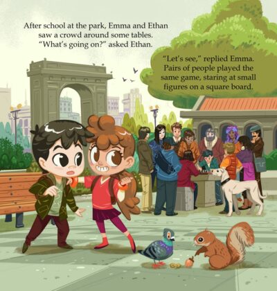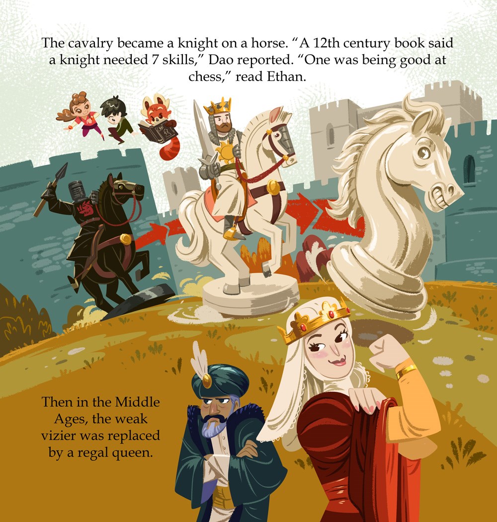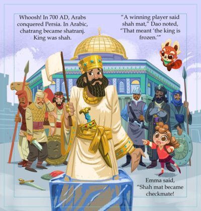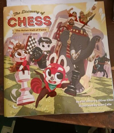 That new goodie was the book The Discovery of Chess: The Asian Hall of Fame by Phil Amara and Oliver Chin. Well, you had me at Oliver Chin. I have enjoyed their Tales from the Chinese Zodiac series, and was looking forward to meeting Phil Amara and Juan Calle (on illustrations). When I first received my copy, I was at work. So I looked, sighed (“our rendezvous must wait I am afraid” I lovingly thought to it) and went back to work. I would not have a moment to quietly read until the weekend. But it was worth any wait I had to endure. This clever, informative and fun story about how chess was invented is along the lines of the Magical History Tour series by Erre and Savoia, but for a slightly younger crowd. However, due to the factual presentation it is not “action filled” in a traditional manner nor is it a typical picture book read or reader/listener. There is not a message, or even just a fun time, but a combination of education with amusement. If you read “between the lines” you will see how politics played a role in shaping how the game would transform into the game we know today. The unfolding of a complex game really has a complex history and was fun to learn about.