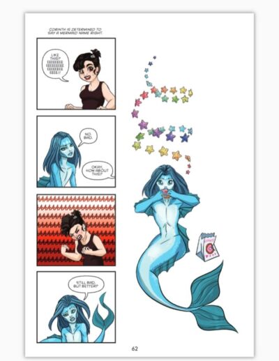 I start my review out with such strong feelings because that is what this originally webcomic now full book (but I read via an online reader copy on Edelweiss) did to me. Gave me strong feelings. I had all the emotions from liking Corinth to not liking her to liking her… ; from liking Skylla to not liking to …. ; and that boyfriend? Seriously, he has a crappy life, but to do Corinth that way? And those friends of his put up with him? Or is he just an a-hole to Corinth? (And btw, the boyfriend will now be known as ButtHead as he shall not be given the honor of the title friend, or a real name). And the family of Crointh has some things going on that really set the tone and what is needed for the story. I understand why the mother is deaf (she is pretty awesome and I like how it is handled very tastefully) as we need our heroine to know ASL, but I was a bit surprised at first. I liked the idea of Corinth being a sweet kid who just wants to clean up the beach and finds a lot more. There is so much more, but to tell you is to tell you the story and you need to read this yourself.