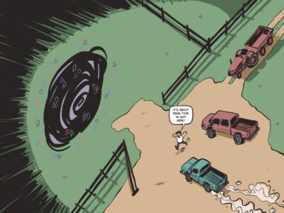 who is The Big Baddie. One of the has-it-been-done-before-but-is-still-somewhat-fresh points is how things are set up like a D&D video game (or like Travis’s favorite video game which obviously is a D&D like game) when things happen (we get the stats of people, the commentary (you now have the sword; your journal has entered this information). Plus there is a “side story” that (so far) seems a bit needless (two farmers who put the hill in hillbilly) is included. Oh, yes, don’t forget the blackhole/vortex. There is also a bonus/side quest that if you know your Halloween TV specials you will recognize two of them.
